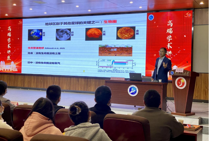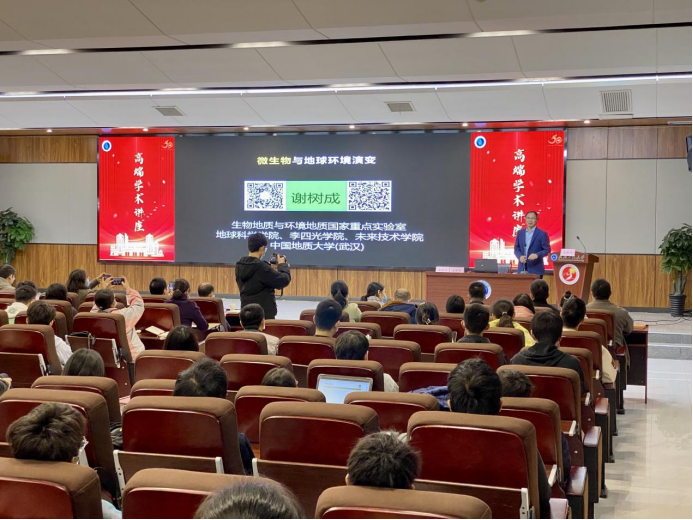 随后,谢树成院士在图灵报告厅做了题为“微生物与地球环境演变”的学术报告。谢院士循序渐进、深入浅出地介绍了地球演化进程中地质微生物的重要性和挑战,提出利用地质脂类来识别岩石保存的地址微生物功能群的新方法。并以湖北神农架大九湖湿地作为典型介绍了一系列反映干湿变化的微生物新指标,提出消除碳排放的泥炭藓和共生微生物的恢复和保护策略。谢院士还结合新冠病毒介绍了地质病毒与古气候的关系,指出地质病毒未来重要突破方向。谢院士就老师们和同学们的提问进行了详细解答,并与师生分享了他在学科建设、人才培养等方面的宝贵经验。