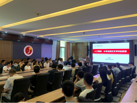 报告会围绕人工智能学科建设、人才培养工作等内容进行交流探讨。会上,焦李成教授作了题为《人工智能:从专业到交叉学科的探索》的报告。焦李成教授首先介绍了人工智能专业交叉学科的特质,现阶段面临的发展与挑战。人工智能是计算机科学、自动控制、电子信息、统计学、数学、脑与认知科学等多学科融合的专业。其次介绍了世界其他国家的人工智能人才培养体系以及我国教育体系的人工智能布局具体情况。最后就人工智能专业人才培养体系,焦成李教授提出了用产学合作、产教融合、科教协同等新工科方式,呈阶梯式、有针对性地完成学生“会做、敢想、能创新”的培养思路,以及“四、三、二、一”的培养体系(四个面向:面向世界科技前沿、面向经济主战场、面向国家重大需求、面向人民生命健康;三个体系:理论教学体系、实验实践体系、创新创业体系;两个创新:创新平台、创新团队;一个目标:培养高水平的创新性人才)。与会师生就人工智能领域相关问题与焦李成教授进行了相互交流和探讨。
