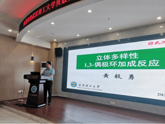 黄毅勇教授以《立体多样性1,3-偶极环加成反应》为题,介绍了课题组在1,3-丁二烯的制备和三价膦催化缺电子联烯的环加成两方面所取得的进展,并提出了相关具有挑战性的研究问题。报告中黄教授详细介绍了烷基硝酮的1,3-环加成反应、叶立德构建氮杂环反应和探索偶极环加成的反应历程三个方面的成果。黄教授以实验探索、底物拓展、机理研究的顺序介绍了他的工作,并提出当前领域依旧存在的挑战。同时,黄教授详细地解答了在场师生的提问,并对其课题组提出的方法在合成领域的应用进行了展望。