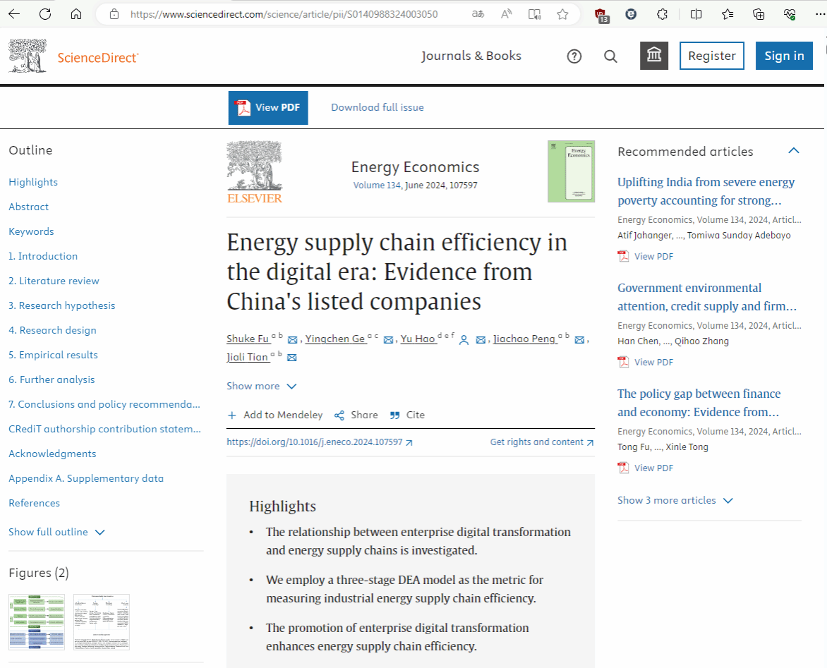 本网讯(通讯员 穆海梅)近日,法商学院(知识产权学院)师生重要成果《Energy supply chain efficiency in the digital era: Evidence from China's listed companies》(数字时代的能源供应链效率:来自中国上市公司的证据)在能源经济学领域国际知名期刊《Energy Economics》上发表。该论文的第一署名单位为尊龙凯时人生就是博法商学院,系法商学院(知识产权学院)青年教师付书科、彭甲超、田嘉莉与金融硕士研究生葛盈辰(新西兰梅西大学金融“1+1+1”项目班)、北京理工大学郝宇教授合作成果。