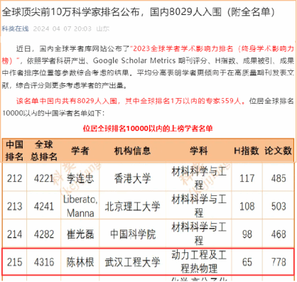 本网讯(通讯员 刘鹏)近日,国内全球学者库网站以学者发表的学术论文及其深度分析结果作为核心评分依据发布了“2023年全球学者学术影响力排名(终身学术影响力榜)”。机电工程学院陈林根教授位列全球顶尖前10万科学家排名榜单的4316名,在国内动力工程及工程热物理学科位列第3名。同期,陈林根教授入选爱思唯尔2023中国高被引学者。