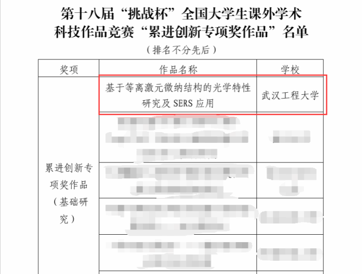 本网讯(通讯员 王祥礼)近日,第十八届“挑战杯”全国大学生课外学术科技作品竞赛“累进创新专项奖”获奖名单揭晓,共评选出“累进创新专项奖”作品17件,我校光电信息与能源工程学院、数理学院马良老师团队的《基于等离激元微纳结构的光学特性研究及SERS应用》项目为湖北省入选的3项“累进创新专项奖”之一,这也是我校首次在“挑战杯”全国大学生课外学术科技作品竞赛中获得该类别奖项。