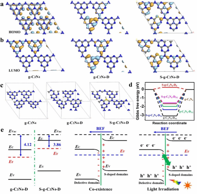 图:(a)g-C3N4、g-C3N4-D和S-g-C3N4-D-的HOMO和(b)LUMO的电荷密度分布。(c)g-C3N4、g-C3N4-D和S-g-C3N4-D的H*活性中间体的优化结构。(d)g-C3N4、g-C3N4-D和S-g-C3N4-D上的吉布斯自由能图。(e)光催化异质结的电荷转移机理示意图。