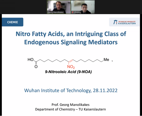 11月28日,Georg Manolikakes教授以《Nitro Fatty Acids, an Intriguing Class of Endogenous Signaling Mediators》为题,详细讲述了以常见结构单元的烷基溴化物为起始物,通过模块化的合成策略高效合成硝基脂肪酸(NFA)的方法。Georg Manolikakes教授通过多组分一锅法合成策略简化了NFA的合成,还对不同NFA靶标的特定结构、活性关系和选择性进行了详细分析与介绍,为进一步研究改善硝基脂肪酸类化合物的药代动力学和治疗效果提供了重要参考。