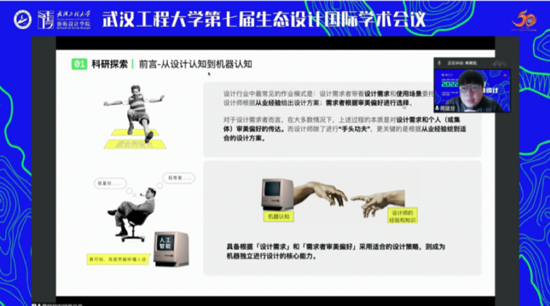 华中师范大学美术学院副院长郑达针对《感知机器与AI协同的艺术与设计》,探讨了在全球媒体科技语境下的艺术创作方式,提出了感知机器与AI艺术协同的创新思路。