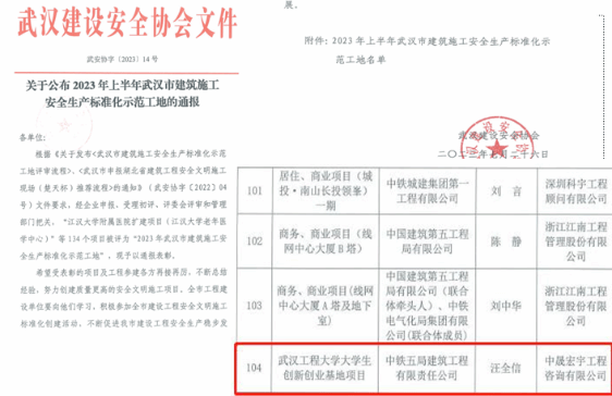 本网讯(通讯员 张旭东)近日,大学生创新创业基地项目继“红旗工地”后再获“示范工地”称号。武汉市建设安全协会通报表彰大学生创新创业基地项目为“2023年上半年武汉市建筑工地安全生产标准化示范工地”。