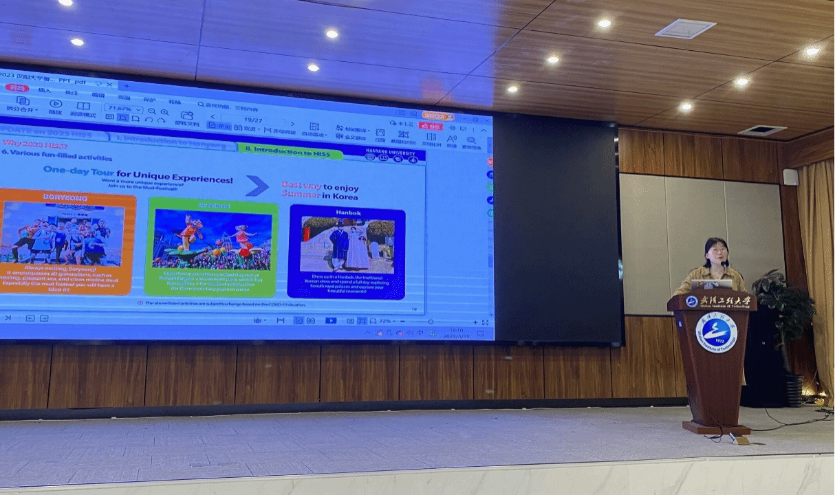 随后,澳门大学研学项目负责人彭老师详细介绍了剑桥大学2023暑期研学、日本早稻田大学2023暑期研学以及港澳2023年暑期研学项目,国际交流与合作处凌老师介绍了湖北省教育对外交流服务中心推出的2023年省高校优秀大学生国际夏令营线上线下项目,韩国汉阳大学研学负责人梁老师具体介绍了韩国汉阳大学暑期研学、新加坡暑期研学及西班牙巴塞罗那自治大学及欧洲暑期研学项目,最后香港地区名企实习项目负责人刘老师具体介绍了实习的安排。