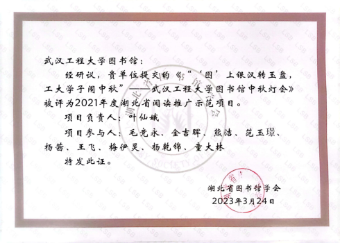 本网讯(通讯员 毛竞永 杨茜)近期,湖北省2021年度全民阅读推广示范项目评选结果揭晓,3月30日在湖北省图书馆学会举办的“新时代图书馆高质量发展”2022年度学术年会开幕式上颁发了奖项,我校图书馆“‘图’上银汉转玉盘,武工大学子闹中秋”中秋灯会活动荣获“湖北省阅读推广示范项目”称号。