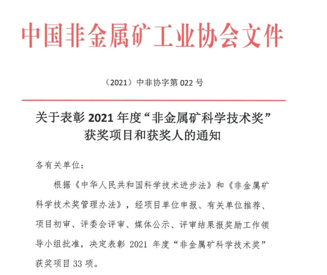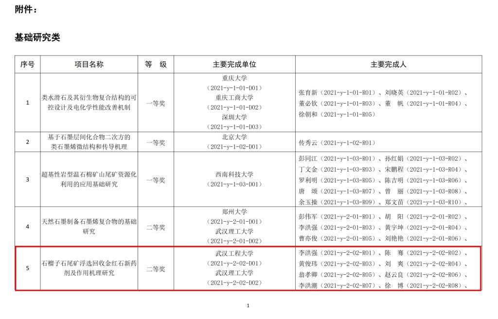 本网讯(通讯员 李洪强)近日,中国非金属矿工业协会发布了2021年度“非金属矿科学技术奖”获奖项目和获奖人的通知,决定表彰2021年度“非金属矿科学技术奖”获奖项目33项,资源与安全工程学院青年教师李洪强副教授牵头的项目《石榴子石尾矿浮选回收金红石新药剂及作用机理研究》获“非金属矿科学技术奖”基础研究类二等奖。