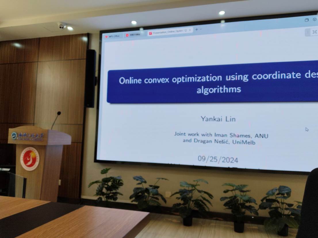本网讯(通讯员 曾祥进)9月25日下午,计算机科学与工程学院(人工智能学院)特邀荷兰埃因霍温理工大学林严凯研究员在计算机大楼与师生们进行交流,作了题为“Online Convex Optimization Using Coordinate Descent Algorithms”的学术报告。报告会由计算机学院副院长周华兵教授主持。计算机科学与工程学院(人工智能学院)相关专业教师和博士研究生、硕士研究生参加会议。