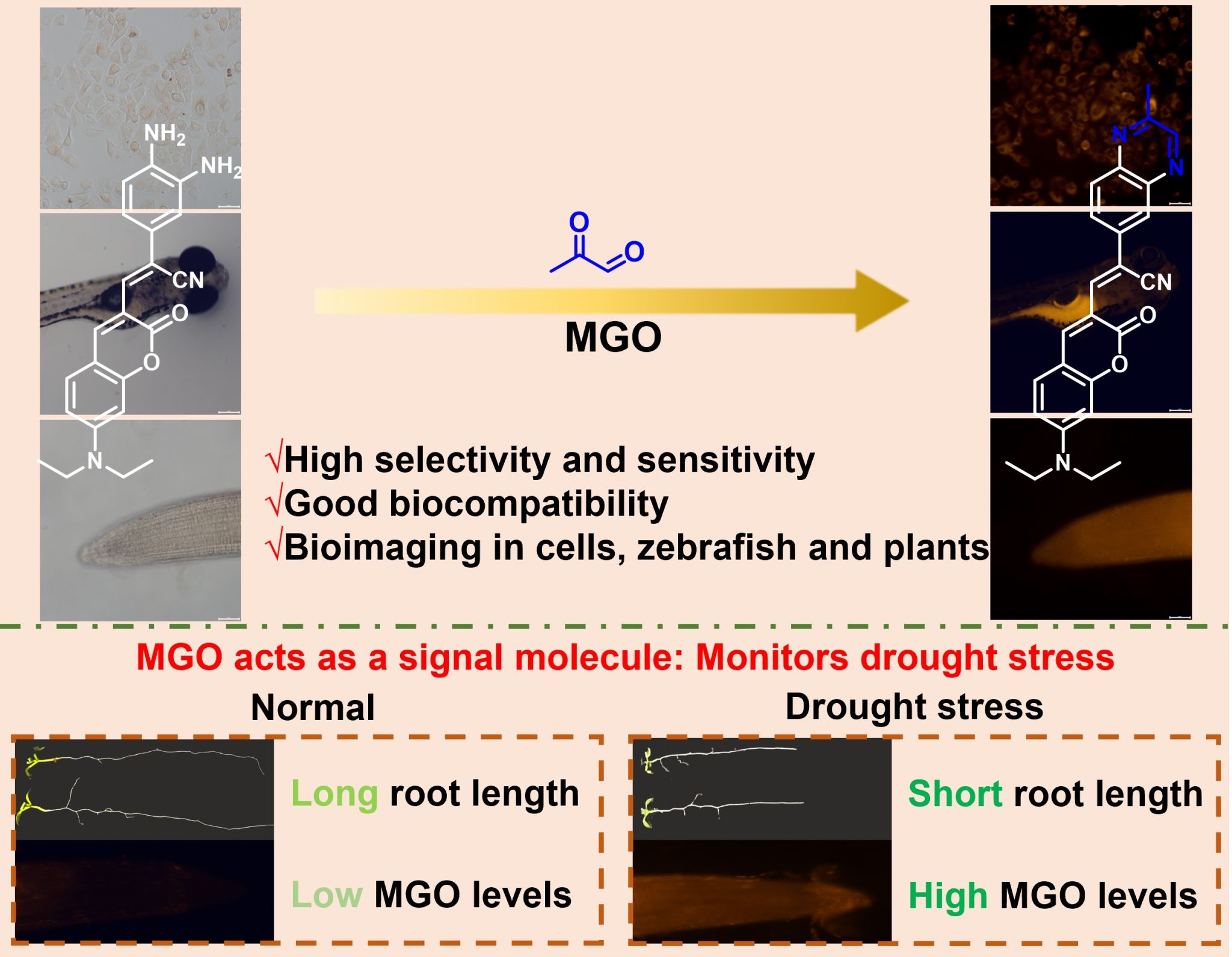 本研究成功设计并开发了一种新型荧光探针(CNDS),该探针适用于检测和成像活细胞、动物和植物中内源性和外源性甲基乙二醛(Methylglyoxal, MGO)。CNDS对MGO的检测展现出高度的特异性与灵敏度,并具有出色的选择性、稳定性及较低的检测限。此外,CNDS成功用于监测干旱胁迫下拟南芥根组织中MGO水平的动态变化,研究结果表明干旱胁迫会导致内源性MGO含量增加,进而抑制根部的生长。这些发现提升了荧光探针在植物生物学研究领域的应用潜力,探针CNDS有望发展成为监测植物生长状态的重要工具。