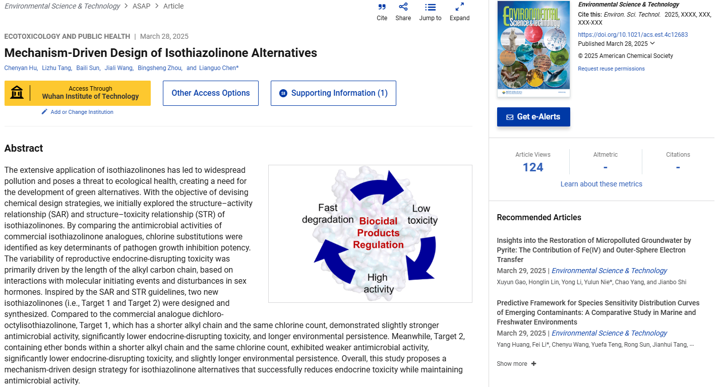 本网讯(通讯员 胡陈艳)近日,环境科学与工程领域顶级期刊Environmental Science & Technology(ES&T)在线发表化学与环境工程学院胡陈艳老师为第一作者(化学与环境工程学院为第一单位)的研究论文“Mechanism-Driven Design of Isothiazolinone Alternatives”。