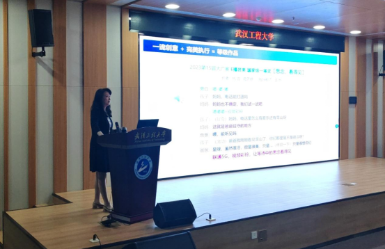 王晔为师生介绍了大广赛的相关主题和内容,重点以武汉大学学生在赛事中获得国家级奖项的各类作品为例,王晔老师通过逐一点评解析参赛作品,从创意理念、技术实现、艺术表现等维度系统阐释作品的创作亮点和艺术价值。这种多维度的深度剖析不仅向师生展示了优秀作品的生成逻辑,更通过案例示范引导教学双方深入理解如何依托个人专业优势,有机融合多种艺术表现手法,进而掌握提升作品创新性和感染力的实践路径。王晔老师强调,从“创意破圈思维”切入,剖析广告艺术的核心逻辑。她提出“广告的灵魂在于创意,但再好的创意也需要实际落地呈现在观众眼前。唯有经历完整的创作周期历练,方能建构对影视广告生产机制的系统性认知。在此过程中,学生的视听语言运用能力、叙事逻辑建构能力及数字技术整合能力得以协同发展,有效促进专业素养的迭代升级,最终达成应用型人才的培养目标。”