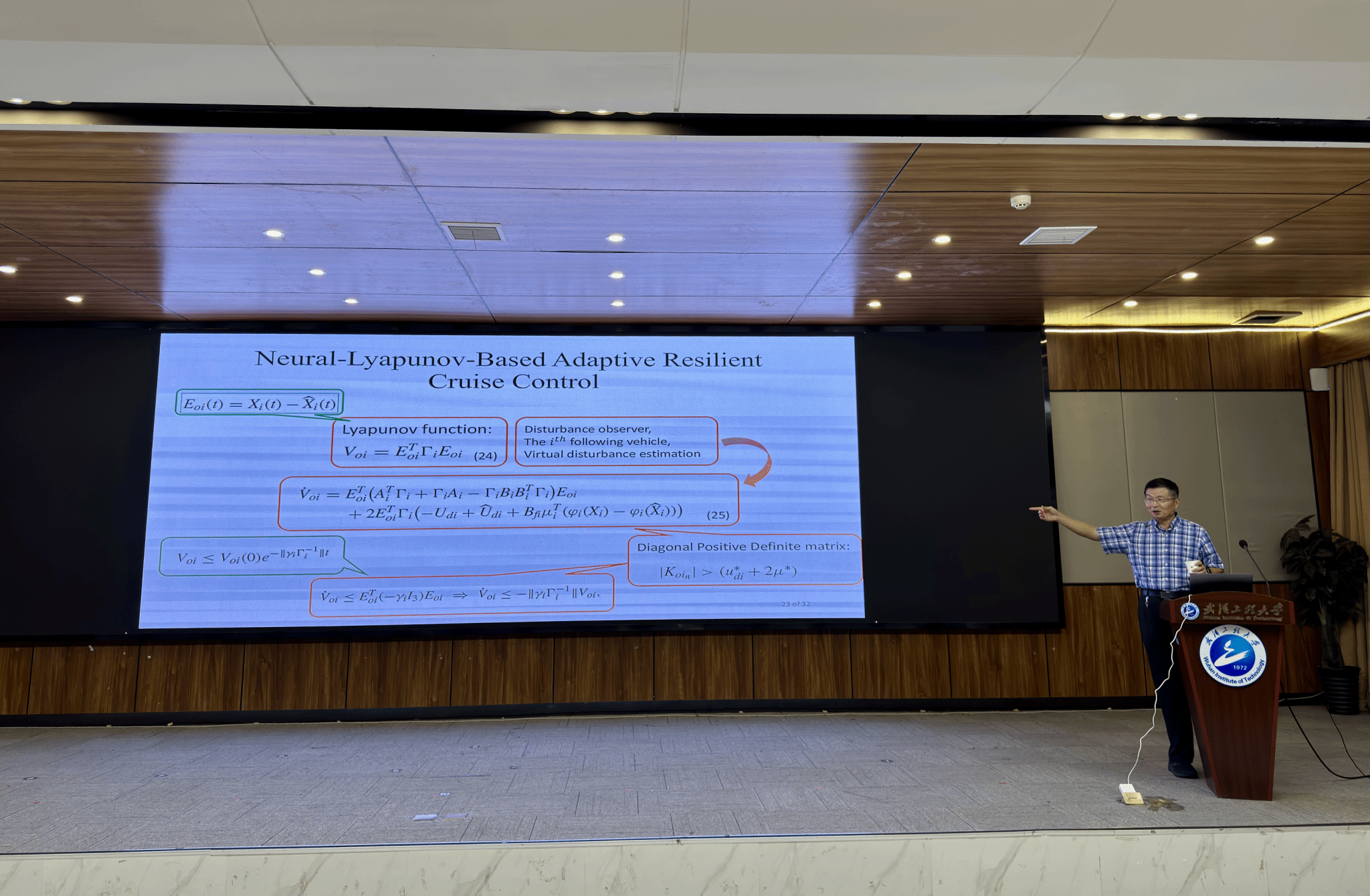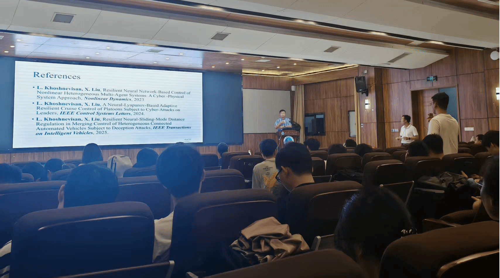 刘新芝教授以人工智能技术在自动驾驶中的应用为背景,针对网联自动驾驶车辆的自主安全控制需求,深入浅出地介绍了自动驾驶车辆中的领导者和追随者在遭受欺骗攻击或外界干扰(如天气、路况)下引起失控或系统崩溃问题,提出了基于神经李雅普诺夫方法的非线性自适应弹性巡航控制方法,并运用生动典型案例进行了详细说明。报告会上,刘教授特别强调,这项研究成功实现了控制理论(李雅普诺夫稳定性分析)、人工智能(神经网络学习)和网络安全(攻击建模与防御)三大领域的深度交叉融合,并从实际工程应用中凝练出背后隐藏的科学问题,通过模型构建、稳定性分析、控制器设计、数值示例等研究步骤详细展示了该研究的有效性和广泛应用前景。与会人员围绕报告内容进行了热烈讨论和交流。