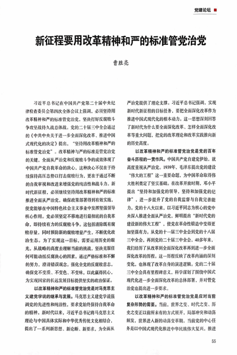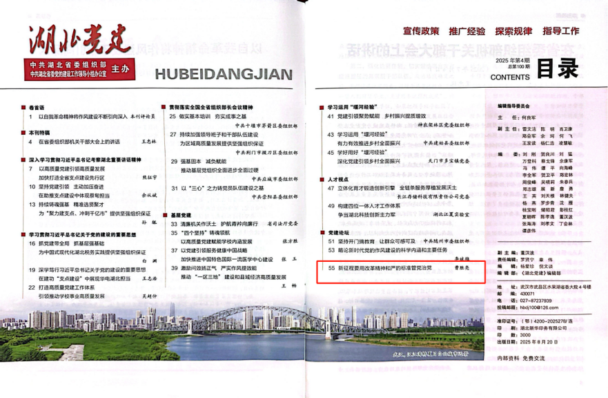 本网讯(通讯员 焦紫怡)近日,《湖北党建》刊登马克思主义学院院长曹胜亮的文章:《新征程要用改革精神和严的标准管党治党》。文章坚持以习近平新时代中国特色社会主义思想为指导,深入学习贯彻党的建设的重要思想,强调必须坚持用改革精神和严的标准管党治党,打好反腐败斗争攻坚战持久战总体战,体现党自我革命的决心。文章认为,推进全面从严治党,必须坚定不移进行最彻底的自我革命,持续有力清除腐败存量、预防增量,不断优化政治生态,强化全党反腐败意志,确保党不变质、不变色、不变味,以此赢得民心,为实现国家长远发展目标提供坚实政治保证。