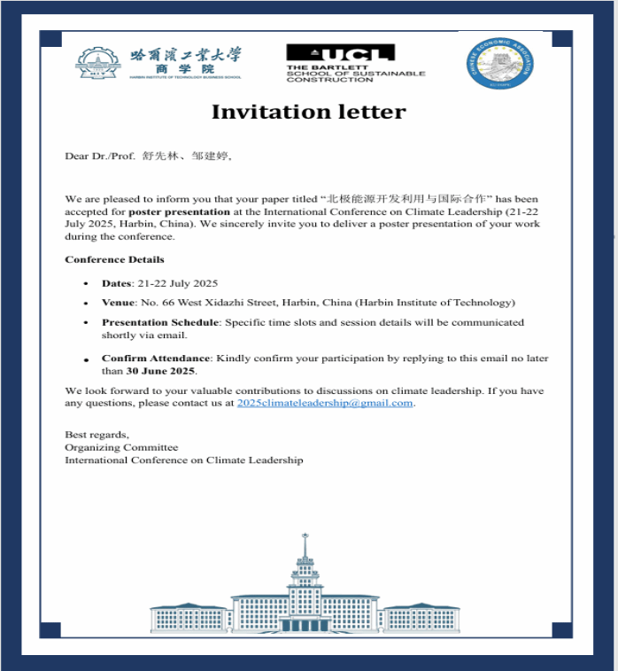 本网讯(通讯员 邹建婷)近日,首届气候领导力国际会议在哈尔滨工业大学召开。会议聚焦“国际气候合作”“国家与区域气候治理”“气候融资与投资”“企业气候战略与领导力”“低碳技术与创新”等主题并开展深入研讨交流。我校马克思主义学院教授舒先林和硕士研究生邹建婷撰写的《北极能源开发利用与国际合作》一文受邀参会并做海报展示。