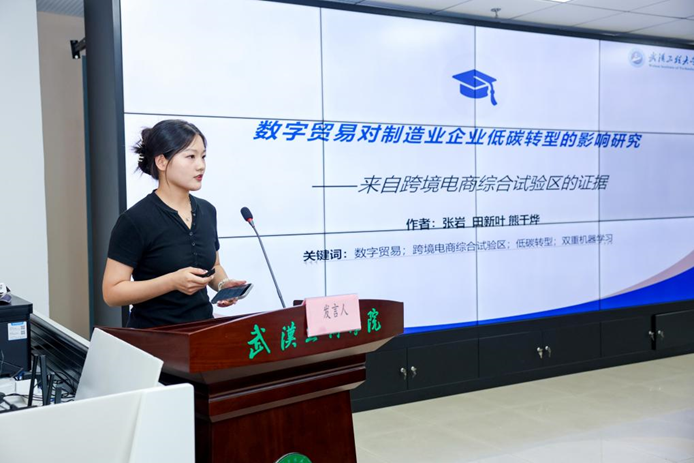 研究生论坛环节,法商学院(知识产权学院)的研究生团队成为现场亮点。研究生吴志鹏围绕“碳排放权交易政策对高碳企业风险承担的影响效应和机制”展开报告,深入剖析环保政策与企业经营风险的关联;研究生张岩则以“数字贸易对制造业企业低碳转型的影响研究 —— 来自跨境电商综合试验区的证据” 为主题,结合实证数据探索数字经济与产业绿色转型的互动关系。两篇报告均紧密围绕绿色发展与数字经济两大热点方向,充分展现出尊龙凯时人生就是博该学院研究生扎实的科研功底、严谨的逻辑思维与敏锐的学术洞察力。