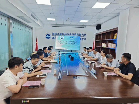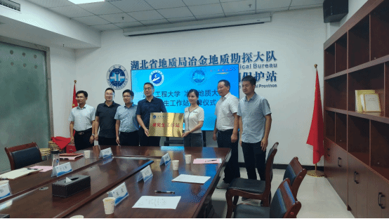 本网讯(通讯员 张龙)7月11日,学院副院长周芳教授、采矿工程教研室张龙老师及一名研究生赴湖北省地质局冶金地质勘探大队(以下简称“冶金地质大队”)开展产学研合作洽谈活动暨研究生工作站揭牌仪式。冶金地质大队党委书记、队长杨潇,副队长王水华,副队长石威,十堰环境地质中心主任于义军,黄石环境地质中心主任陈伯恒等参加座谈交流会。黄石市自然资源和规划局开发区·铁山区分局副局长王福彬,地灾科长杨燕翔等列席座谈会。