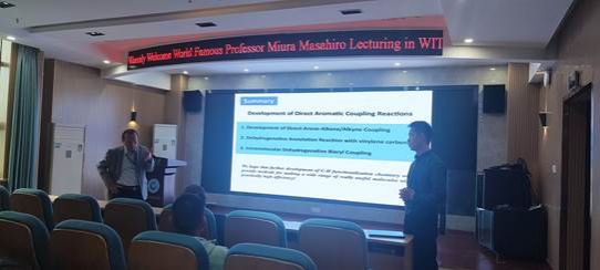 来访期间,Miura教授为我校师生分别做了题为《Development of Direct Aromatic Coupling Reactions》以及《Palladium-catalyzed C–H Arylation of Benzophospholes with Aryl Halides 》的学术报告,通过“芳烃-烯/炔烃直接偶联的发展”、“与乙烯碳的脱氢环化反应”和“分子内脱氢双芳基偶联”三个方面对其课题组在近年的工作进行了详细的介绍。由于多环杂芳基骨架广泛存在于许多天然化合物和常见的官能分子中。因此,发展新型高效的构建稠合环骨架的合成方法已成为化学家们的研究热点,Miura教授近些年发展的过渡金属催化的C-H活化策略已成为合成杂环及复杂天然产物的有效工具。学术报告结束后,Miura教授回答了在场师生提出的学术问题,并与现场师生进行了深入的交流,Miura教授也参观了化环学院部分老师的科研实验室。