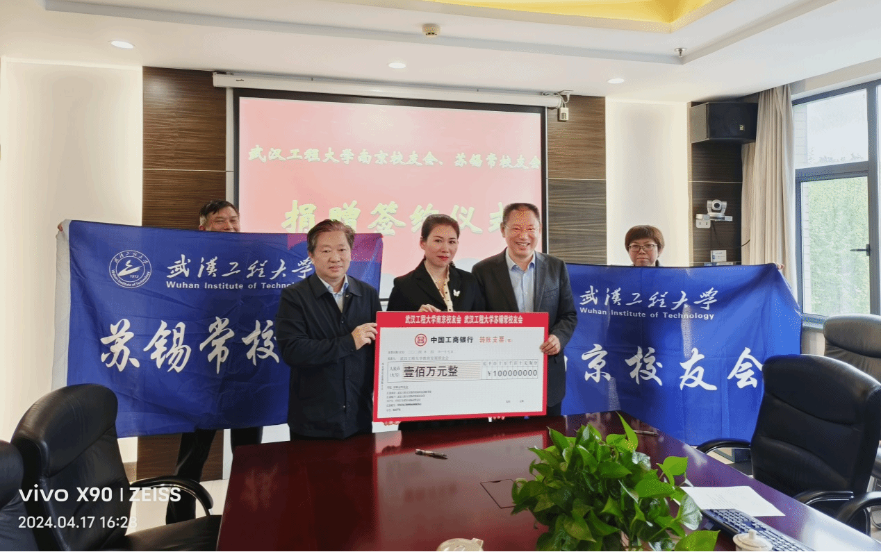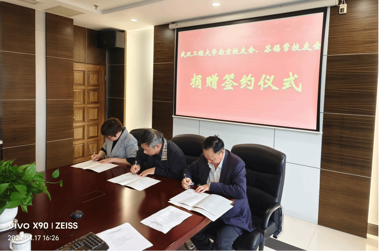 南京校友会会长马艳梅、苏锡常校友会会长肖春阳与基金会秘书长邓新洲签订捐赠协议。基金会理事长叶芃向捐赠方颁发了捐赠证书和教育贡献奖奖杯。