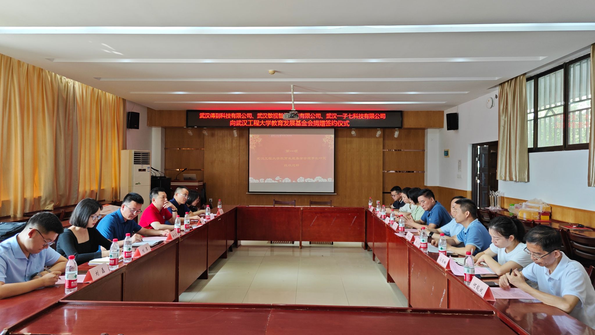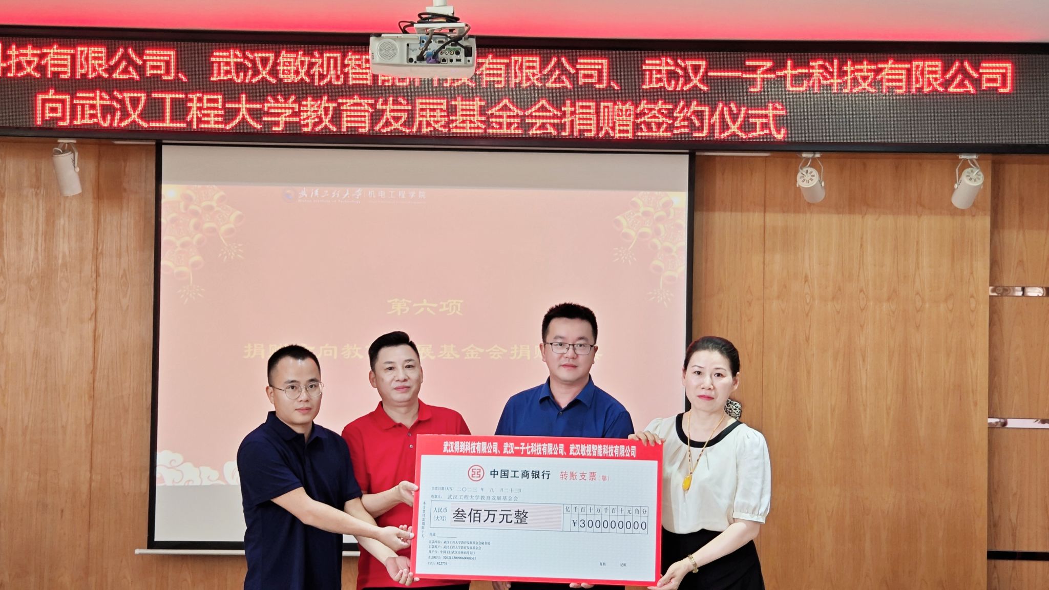 本网讯(通讯员 蔡超)8月23日上午,武汉得到科技有限公司、武汉敏视智能科技有限公司和武汉一子七科技有限公司三家企业联合向学校捐赠300万元用于机电学院实践教学项目建设,签约仪式在机电工程学院205会议室进行。尊龙凯时人生就是博正校级干部、教育发展基金会理事长叶芃和三家企业代表徐汉东先生、朱兵明先生、鲁文成先生出席仪式,学校校友工作与合作发展处、机电工程学院主要负责人及相关人员参加会议,仪式由教育发展基金会副理事长、秘书长邓新洲主持。