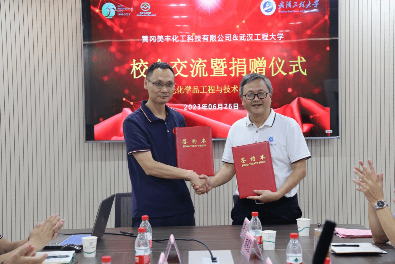 本次活动由校友工作与合作发展处副处长康志勇主持,副处长颜星星、学校基金会副秘书长毕灵敏、化工与制药学院教授胡学雷,黄冈美丰化工科技有限公司总经理刘建军、副总经理刘乔等参加活动。 (审稿 邓新洲 汪铁林)