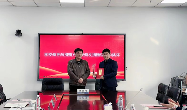 基金会理事长叶芃代表学校向泸州荆楚酒类销售有限公司总经理叶伟颁发了捐赠证书与教育贡献奖杯。