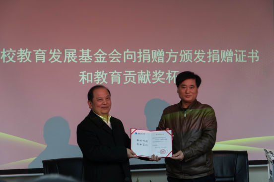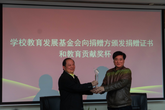 叶芃代表学校教育发展基金会向蔡再华颁发捐赠证书和教育贡献奖杯,并向蔡再华颁发客座教授聘书。