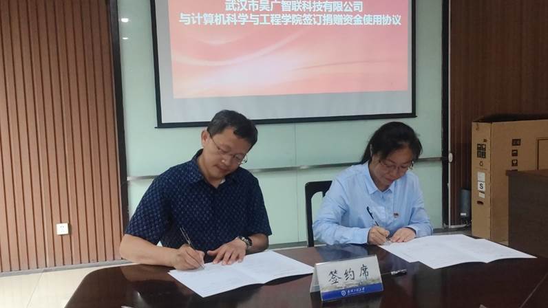 计算机学院党委书记张炜与董事长陈天来签订捐赠资金使用协议书。