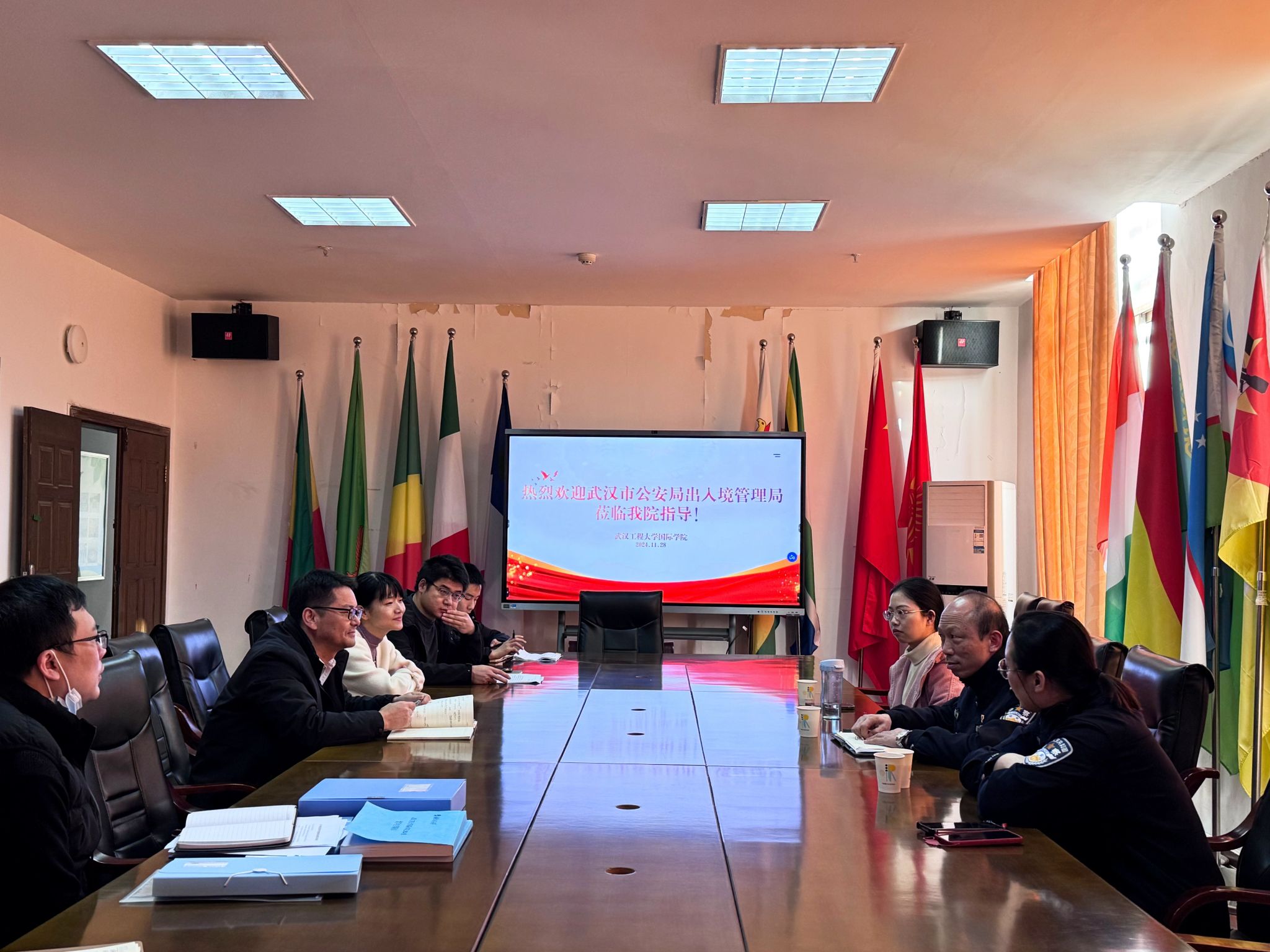 随后,国际交流合作中心、国际学院直属党支部书记桂展鹏向出入境管理局集中汇报了我校来华留学生管理的相关工作制度与工作举措,并表示国际学院将不断加强与出入境管理局等部门的沟通与协作,同心合力提升在鄂来华留学生管理的高质量发展。