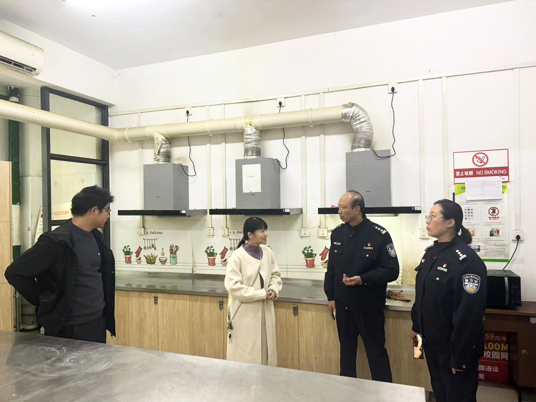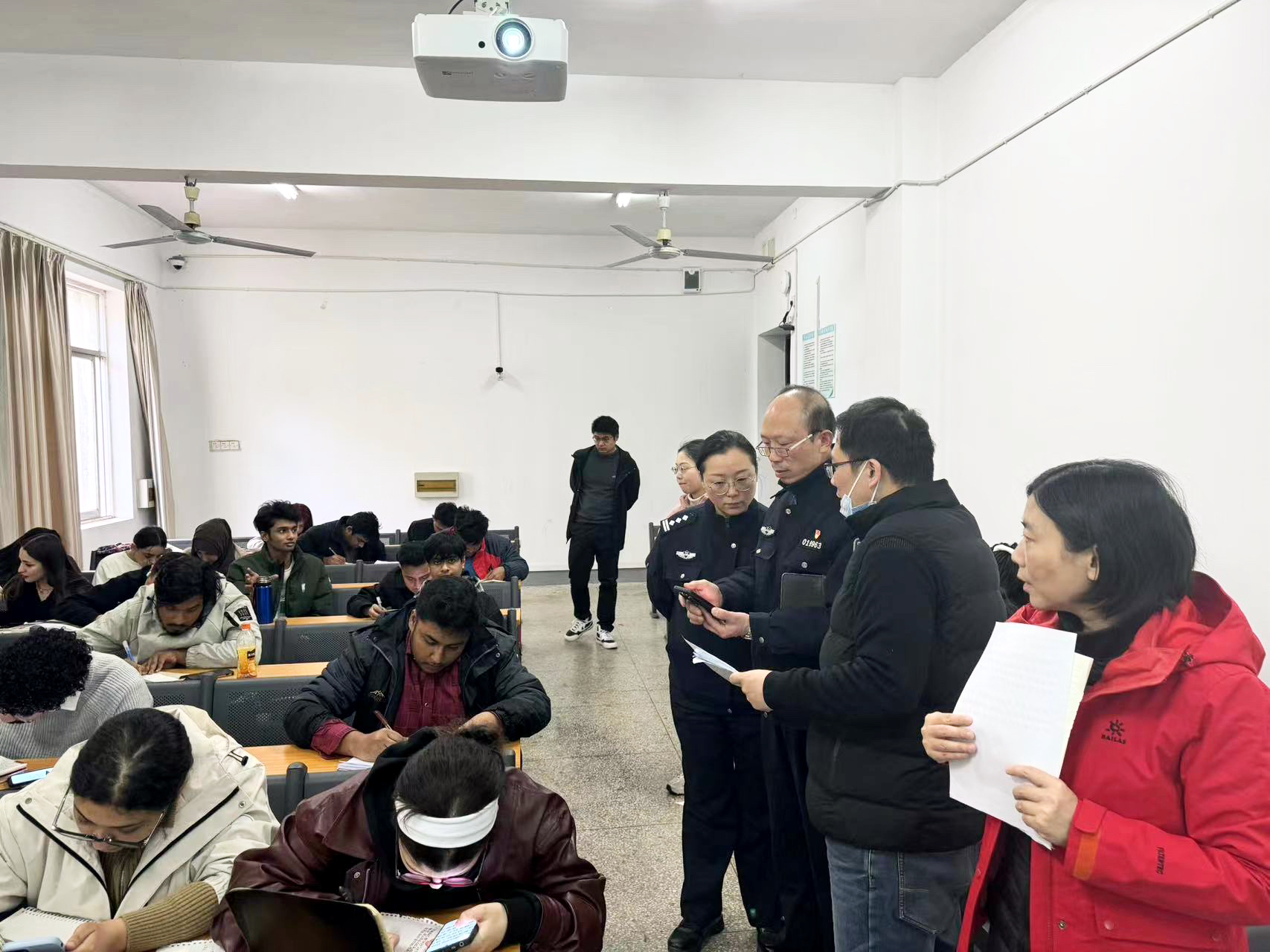 出入境管理局一行在国际交流合作中心副主任、国际学院副院长杨晨晨及留学生管理办公室全体人员的陪同下,实地走访了我校来华留学生公寓,并突击检查了留学生在教室上课情况。通过实地检查来华留学生班级考勤表、留学生联网信息册、留学生公寓安全设施、留学生公用厨房等场所,出入境管理局对我校来华留学生的日常教学管理、学生管理工作机制与实效均给予高度认可。