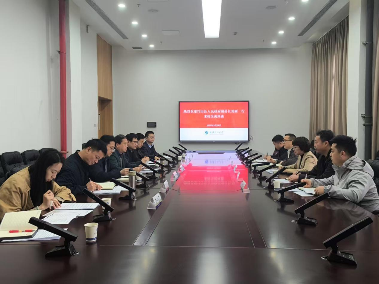 本网讯(通讯员 彭嘉禾)3月28日上午,湖北省十堰市竹山县副县长刘丽率队来校调研交流,座谈会在综合楼206会议室举行。校党委常委、副校长吴云韬出席会议,会议由科学技术发展院副处长闫志国主持。