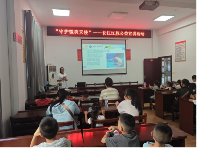 课堂上,志愿者通过小问答与观看视频的方式向小朋友们科普科学知识,区分了江豚与其他水生生物的差别,介绍了江豚的生活习性,并向小朋友与家长们介绍当今江豚因污水排放,非法捕捞而面临的难题,呼吁大家积极采取行动保护环境,关爱江豚,为营造适宜江豚生活的美好环境共同努力,引起了小朋友以及家长们对环境保护的重视。