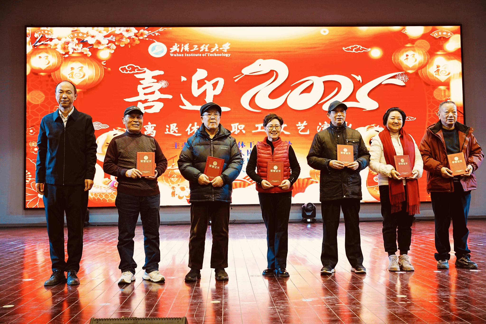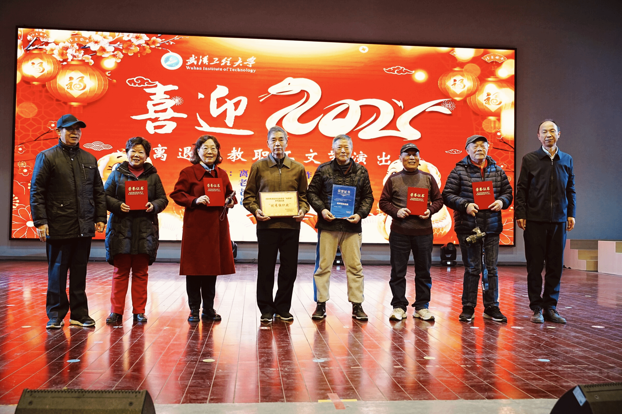 演出期间,主办方对今年在各项活动中表现突出、积极奉献的老同志予以了表彰。原武汉化工学院化工系已故副教授刘葆中老师,将其毕生积蓄25万元无私捐赠给学校,用于支持人才培养与建设发展。他的这一善举,赢得了全场观众的热烈掌声和崇高敬意。离退休教职工党委书记、离退处处长史红权、校老协老教协会会长王庆春,为获奖者颁发了荣誉证书。