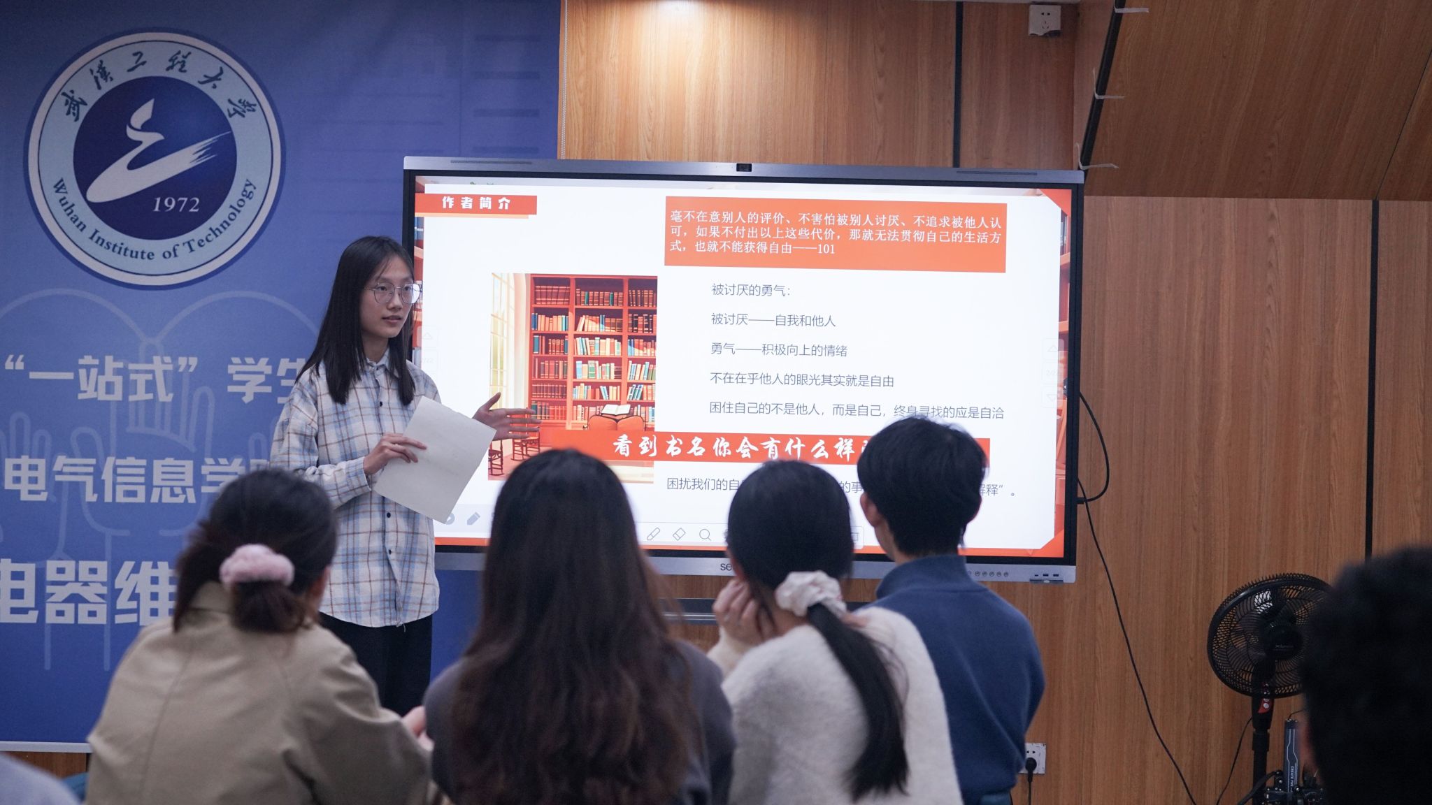 在经典研读环节,管理学院刘鲁润同学和化工与制药学院王泽华同学分享的书籍是《被讨厌的勇气》。这是一本以对话形式深入探讨阿德勒个体心理学的著作。刘鲁润从方法论的层次分享书中所构建的“内求-和解-自洽自由”精神成长路径,通过建立清晰的自我边界实现内在诉求,在与现实的动态平衡中达成精神自洽。王泽华聚焦“课题分离”这一核心理念,结合实验室团队协作案例,论证“尊重独立性是高效合作的底层逻辑”这一学术观点。外语学院张敏同学分享的书籍是《生活中的情绪心理学:来自内心深处的福流》。她分享了书中消极、积极、道德情绪三部分中的愤怒和焦虑、自爱与情绪福流,引导大家认识情绪、理解情绪、管理情绪、运用情绪,感受到来自内心深处的情绪福流。