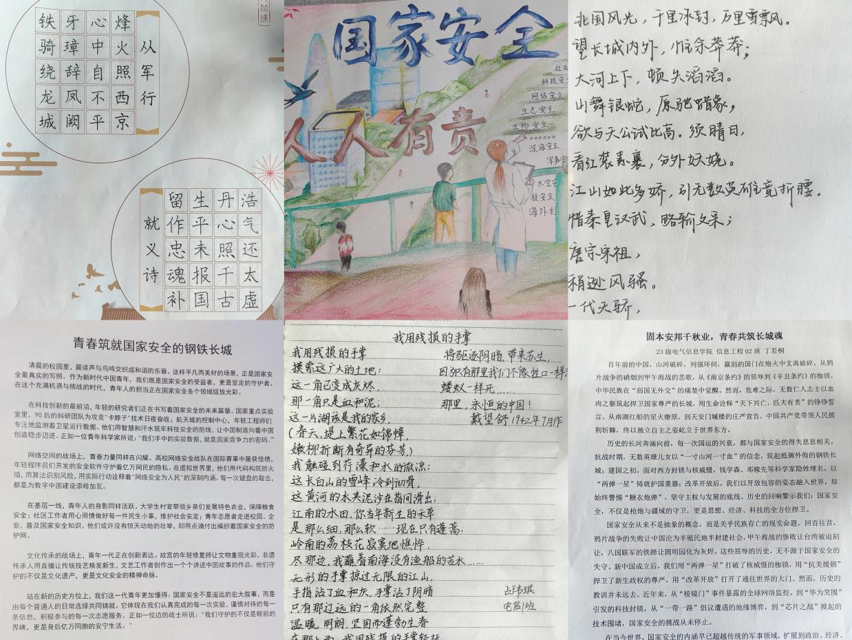 为了营造全员贯彻落实总体国家安全观的浓厚氛围,4月份,学院组织开展国家安全日专题书画作品征集比赛。各参赛选手挥毫泼墨,将心中的家国情怀诉诸笔端。一笔一划都凝聚着他们对国家未来的美好憧憬。有的作品以磅礴大气的画作,挥洒国家安全的精神气象;有的则以端庄大气的楷书,摘录国家安全法律法规的精髓要义。这些书法绘画作品主题鲜明、内容丰富,既有对国家安全战略的深入解读,也有对维护国家安全责任的生动诠释。