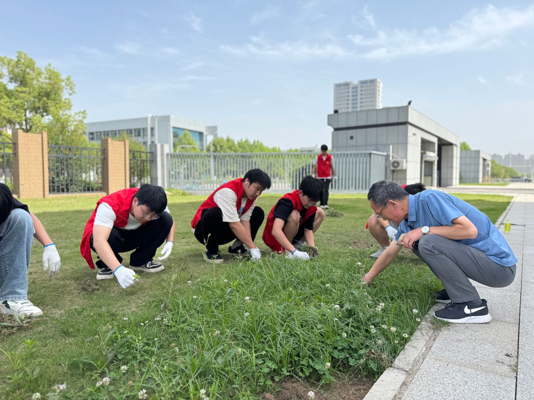 本网讯(通讯员 刘宇 熊川琦) 5月7日下午,30余名“小码农”身着红马甲,手持劳动工具,在后勤保障处专业人员的指导下,对校园绿化带、草坪等重点区域开展杂草清理,这是计算机学院与后勤保障处联合开展的“劳动砺心智 实践促成长”校园义务拔草志愿服务活动。