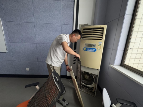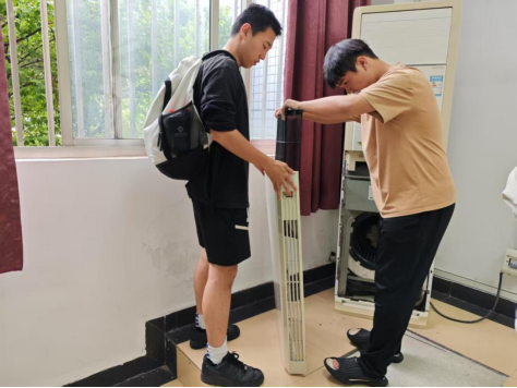 在劳动实践活动中,学生三人清洗小组分工明确、工作规范、配合默契,从空调开关的断电开始、滤网外壳的物理拆卸、过滤网灰尘的清洗、晾晒,再到最后滤网的正确安装。各学生三人清洗小组都有序进行,并且还通过各小组之间的劳动比拼,激发劳动参与满足感、促进劳动获得幸福感。通过一个下午的辛勤劳动,大家一起清洗了108间教室、6间休息室、184台空调,当看到最后清洗干净的空调外机和滤网,开启空调后吹出的清凉、干净、纯净的夏季风后,同学们脸上也洋溢出来喜悦的笑容。