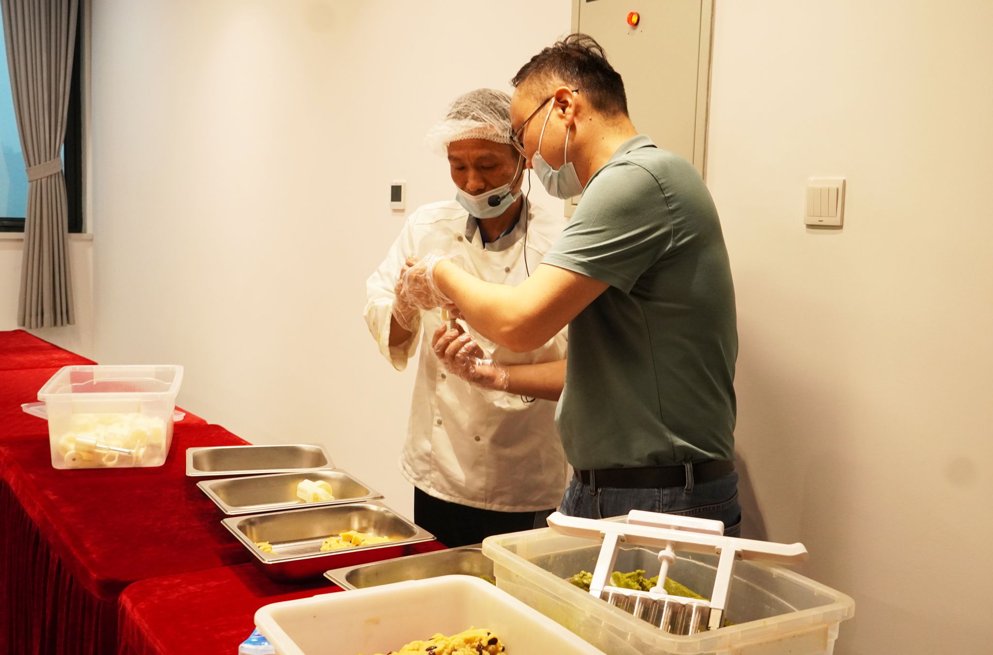 老师们认真聆听、仔细观察,理论讲解结束后,大家就迫不及待地开始动手实践。在面点师的耐心指导下,有的老师负责将绿豆泥揉搓均匀,有的将绿豆糕分线压圆,还有老师熟练地用模具将绿豆糕压制成精美的形状。老师们一边制作,一边相互交流、相互学习,分享着制作心得和生活趣事。