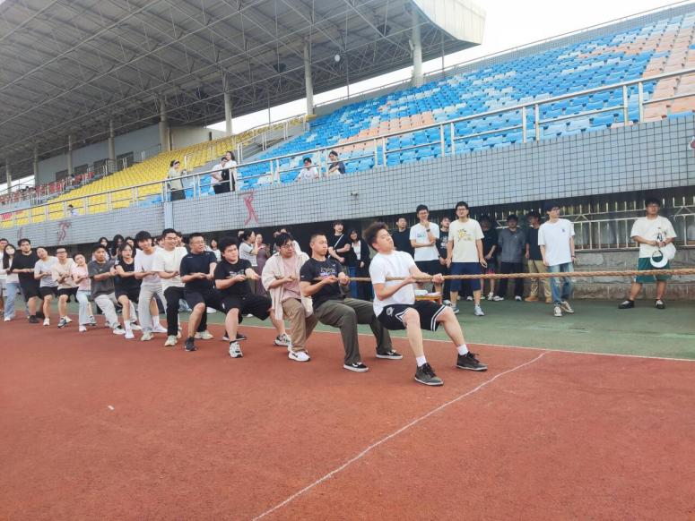 拔河赛场率先点燃激情。 随着裁判哨响,各队16名队员紧握长绳,身体后倾,全力拼搏。标识线在中心线两侧反复拉锯,场边加油助威声此起彼伏,将现场气氛不断推向高潮。两人三足赛道同样精彩纷呈。 选手们手臂相挽,喊着口号协调步伐,在50米赛道上并肩冲刺,洒满欢声笑语与加油呐喊。