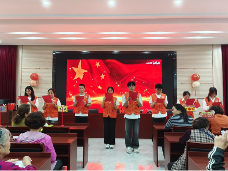 随后进行的文娱活动的演出环节,由化工与材料工程学院“追光”理论宣讲团精心准备了庆双节主题《月满华夏 礼赞家国》的朗诵节目来歌颂祖国、庆祝中秋佳节,志愿者们铿锵有力的声音、充满青春活力的表演,赢得现场老年人们阵阵掌声。