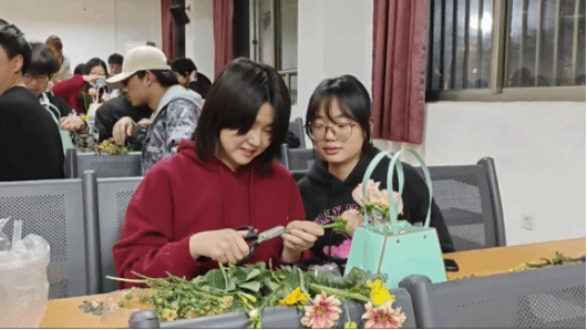 活动结束后,每个小组派代表进行分享,就创作理念、心情情绪等方面真诚分享,大家分享得最多的关键词是“解压”和“生命力”,在活动过程中同学们沉浸参与、体验心流,在花草的生命力感召下,有了尊重生命、珍惜青春的别样体验。
