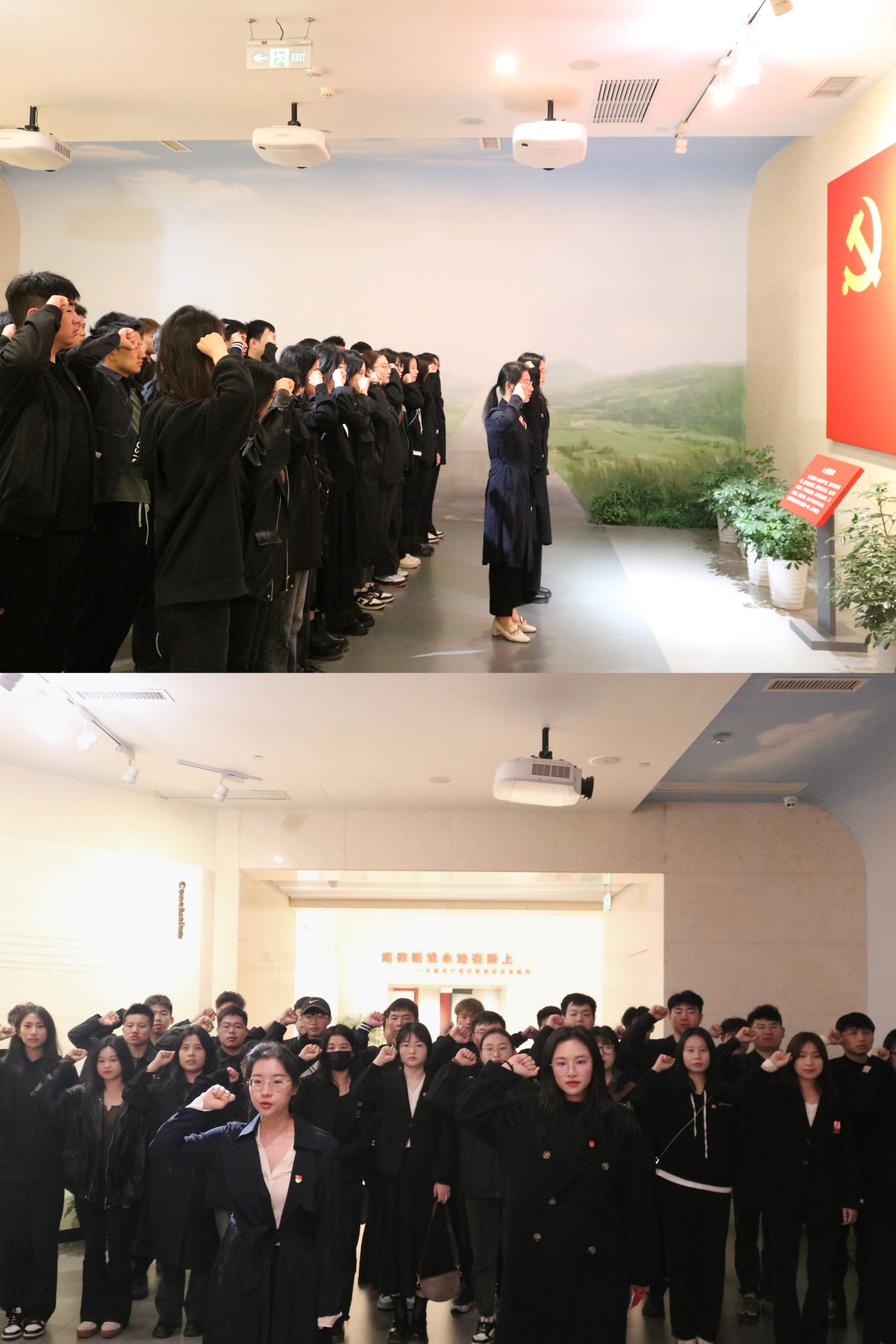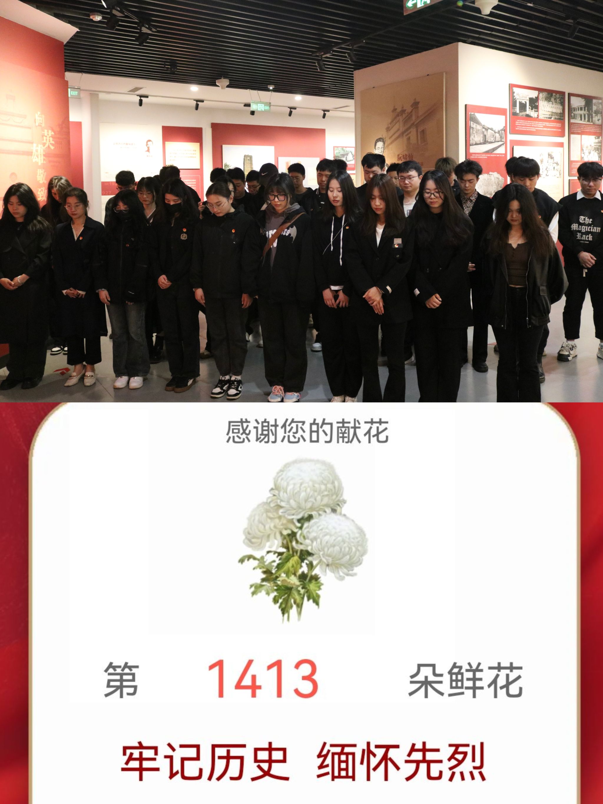 研究生团学骨干们在身临其境中心灵得到洗礼、思想得到升华,深刻读懂大国崛起的艰辛,体悟今日幸福的来之不易。怀揣着对革命先烈的深切哀思之情,全体团学骨干面对英雄雕像列队肃立、默哀沉思、鞠躬致敬、文明祭扫,通过扫描场馆内的二维码向先烈们敬献鲜花。