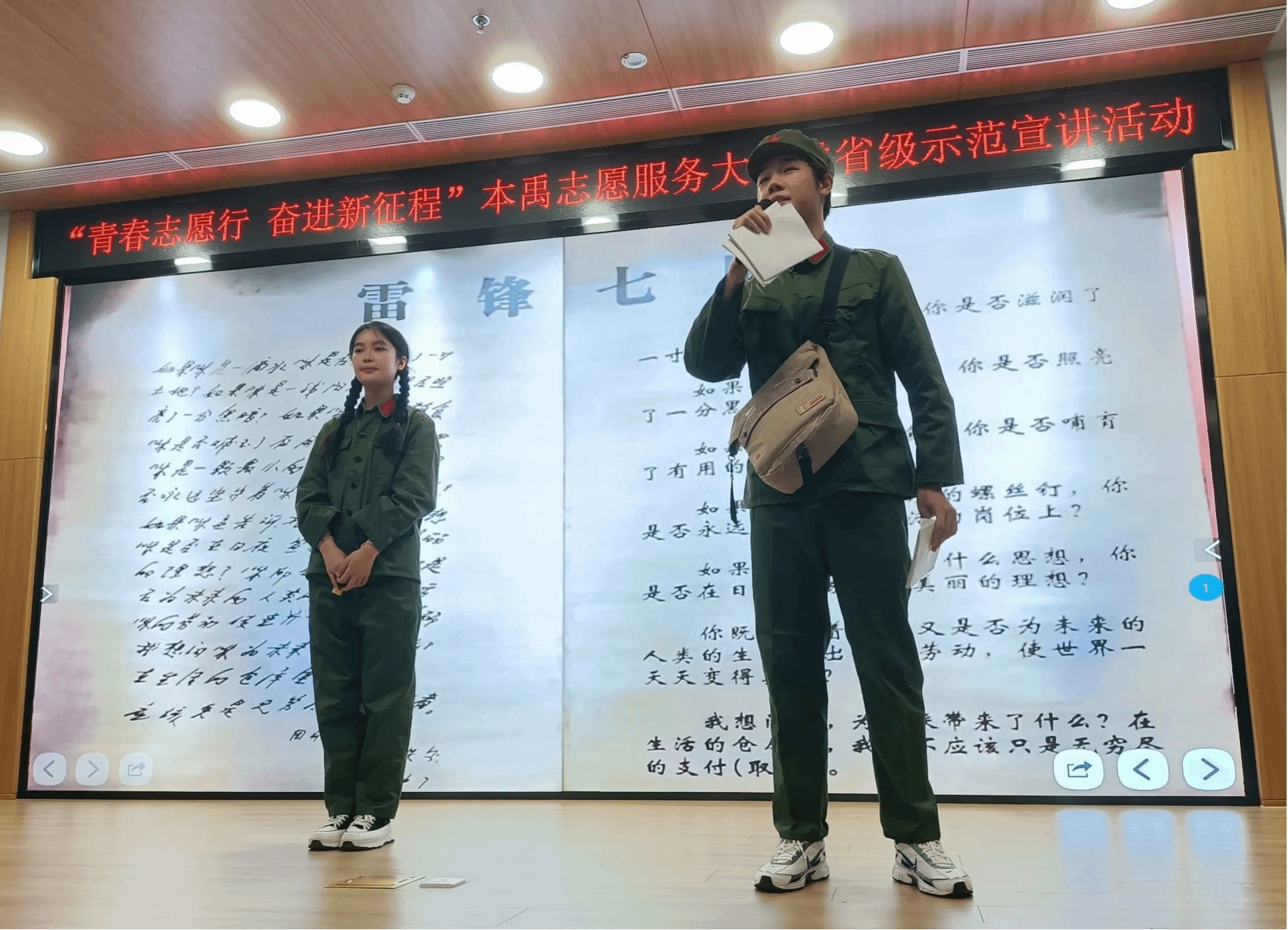 学校黑白话剧社现场生动演绎了雷锋和本禹志愿服务队的先进事迹,彰显了广大志愿者“舍小我为大家”的责任与担当。
