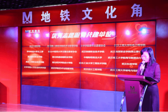 本网讯(通讯员 万浩天 方青松)12月5日,在第38个“国际志愿者”日来临之际,武汉地铁在洪山广场站地铁文化角举行“地铁志愿服务织就城市文明幸福路”2023年度优秀志愿服务集体及个人表彰活动,机电学院“红齿轮”青年志愿者服务团队荣获“优秀共建单位”,2021级本科生、“红齿轮”青年志愿队主要负责人冯默荣获“优秀志愿者”荣誉称号。“红齿轮”青年志愿者服务团队负责人代表陈熹参与颁奖仪式并领奖。