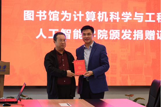 图书馆党总支书记刘少洲为计算机学院颁发图书捐赠证书。