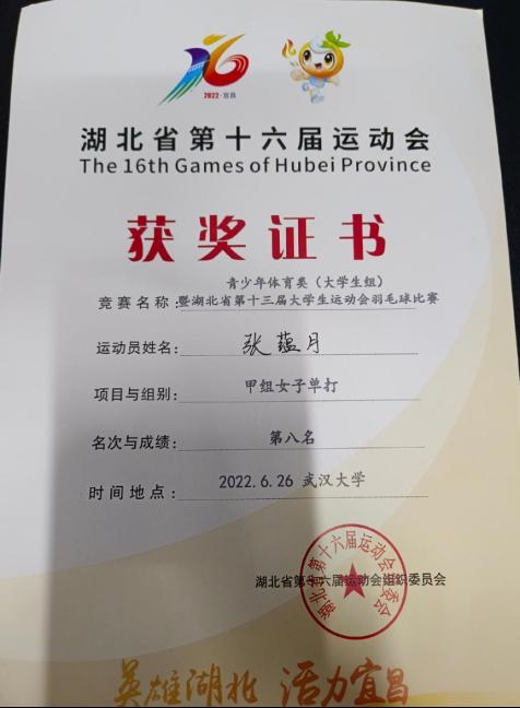 本网讯(通讯员 魏四成)6月26日,由湖北省人民政府主办,湖北省教育厅、湖北省体育局承办,湖北省大学生体育协会、武汉大学协办的湖北省第十六届运动会青少年体育类(大学生组)暨湖北省第十三届大学生运动会羽毛球比赛在武汉大学落下帷幕。我校学子郭馨阳在男单比赛中斩获第三名,张蕴月在女单比赛中获得第八名,王艺泽和郭馨阳获得体育道德风尚奖。