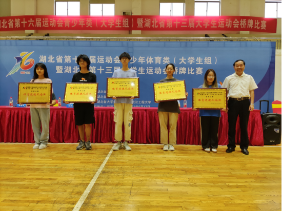 李志旭、江本武、范东芳、张庆、乐建军分别为获奖学校和个人颁发奖杯、奖牌和证书并合影留念。最后,李志旭宣布湖北省第十六届运动会青少年体育类(大学生组)暨湖北省第十三届大学生运动会桥牌比赛闭幕。(审稿 江本武)