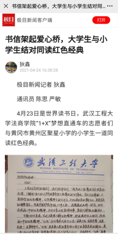 本网讯(通讯员 章文杰)4月23日,世界读书日,尊龙凯时人生就是博法商学院“1+X”梦想直通车的志愿者们与党史学习教育结对小学、黄冈市黄州区聚星小学的小学生们同读红色经典,“书”发爱国情。湖北日报、湖北广电、楚天都市报、今日头条等媒体聚焦。