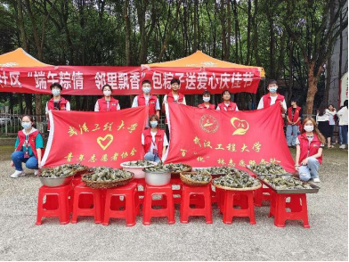 6月2日,端午节前夕,百“化”林志愿者组成小分队,在遵守疫情防控常态化要求下,乘坐校车直达武昌校区,与土木工程与建筑学院、外语学院、兴发矿业学院、邮电与信息工程学院青年志愿者协前往洪山会的同学们携手区卓刀泉社区开展端午节进社区——弘扬传统文化、欢度端午佳节主题活动。志愿者们在社区服务中心工作人员的指引下,将亲手包制的粽子分组送至社区老人的家中。